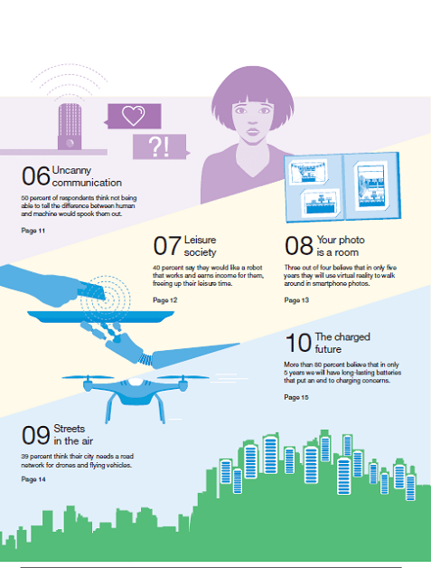 - El futuro cargado: El mundo conectado requerirá de energía móvil. Más del 80 % cree que en solo 5 años tendremos baterías de larga duración que acabarán con las preocupaciones a la hora de cargar