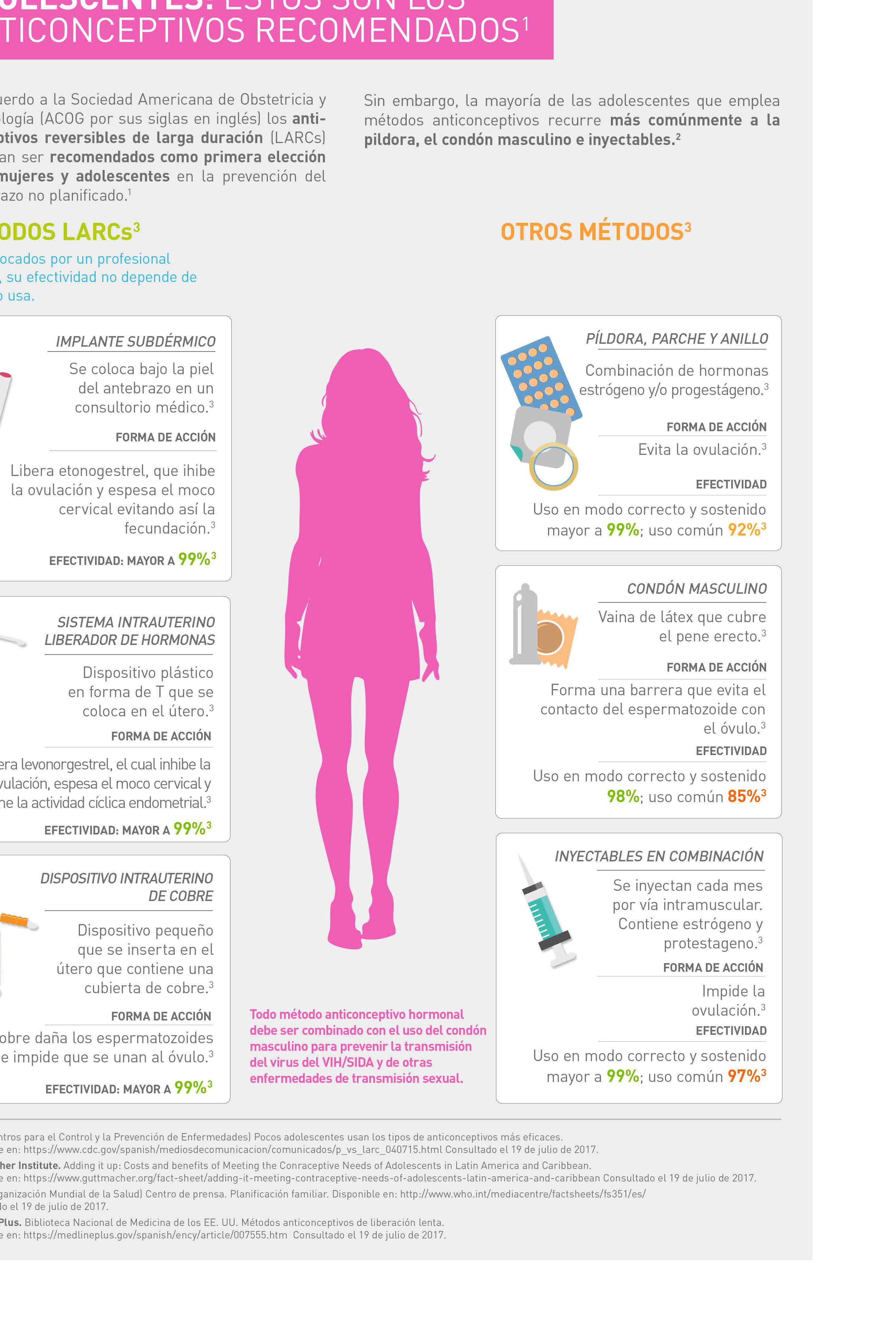 • De acuerdo a la Sociedad Americana de Obstetricia y Ginecología (ACOG por sus siglas en inglés) los anticonceptivos reversibles de larga duración (LARCs) deberían ser recomendados como primera elección para mujeres y adolescentes en la prevención del embarazo no planificado.5