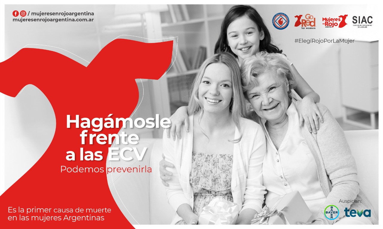 A su vez, la especialista de la FAC aclara: «Es cierto que la posibilidad de tener una ECV en la mujer aumenta con los años, especialmente después de los 55, y que el principal factor de riesgo en las mujeres sigue siendo la edad, pero creemos que no se ha visibilizado lo suficiente el riesgo de padecerla en cualquier etapa de la vida, incluso en los grupos etarios jóvenes» «Según estadísticas realizadas en otros países, aunque suponemos que son muy similares a lo que pasa en el nuestro, hay un estancamiento en la disminución de la mortalidad en las mujeres más jóvenes con ECV, y es posible que eso se deba a que muchas veces no se la reconoce a esa edad y, por lo tanto, no se actúa en consecuencia», sostuvo la Dra. Del Sueldo, que además es directora de “Mujeres en Rojo Argentina”, la rama local de la iniciativa internacional “Go Red for Women”, impulsada por la American Heart Association (AHA) que instala al color rojo como distintivo de la lucha por la prevención de la ECV en las mujeres. En Argentina, la campaña es llevada adelante por la FAC con la colaboración de los laboratorios Bayer y Teva y estará presente en redes sociales con el hashtag #ElegiRojoporlaMujer.
