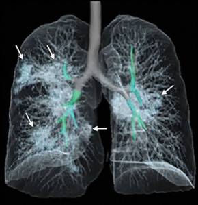 La imagen corresponde a una paciente mujer de 41 años que dio positivo para Coronavirus y presentaba fiebre y tos; en la misma se puede ver cómo la mucosidad llena espacios importantes de sus pulmones (manchones negros).